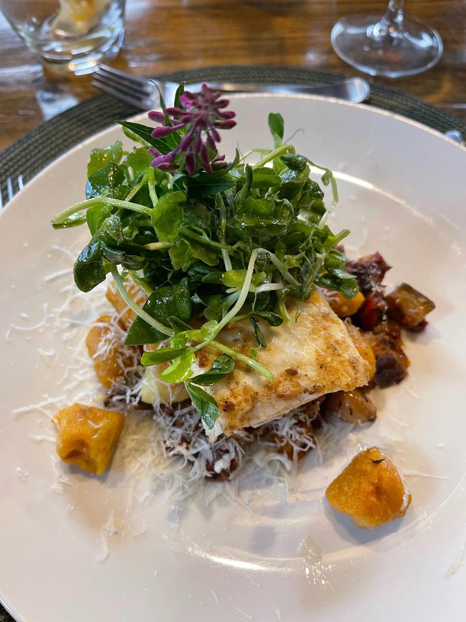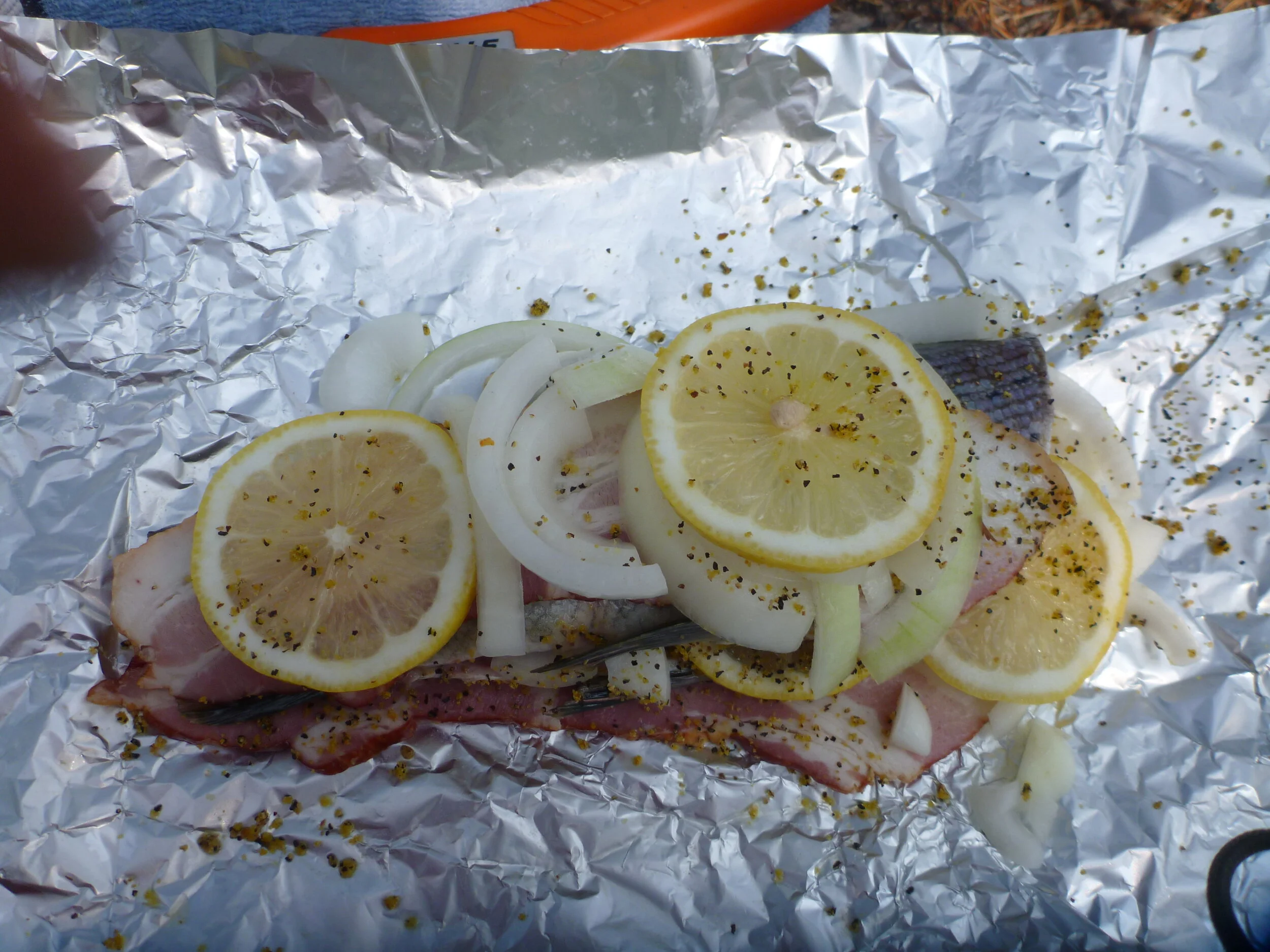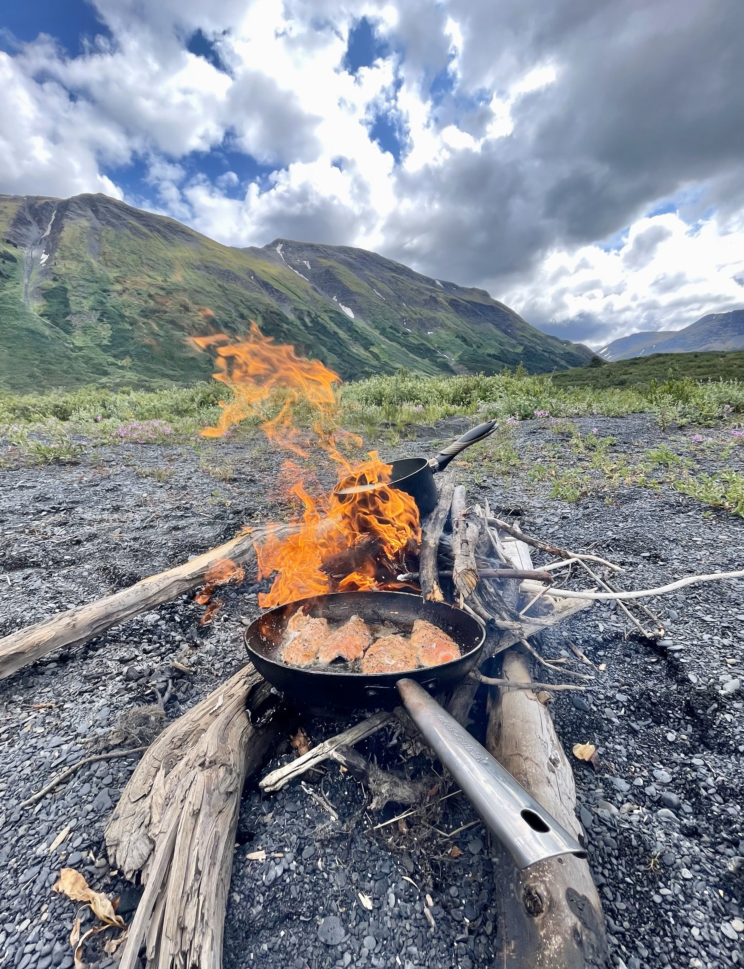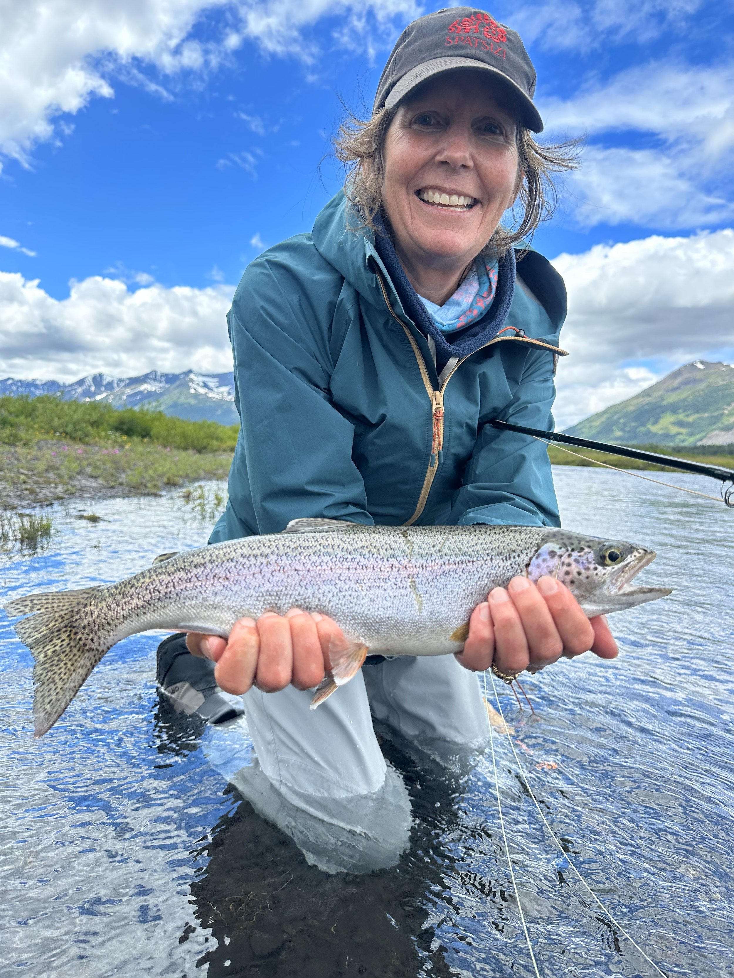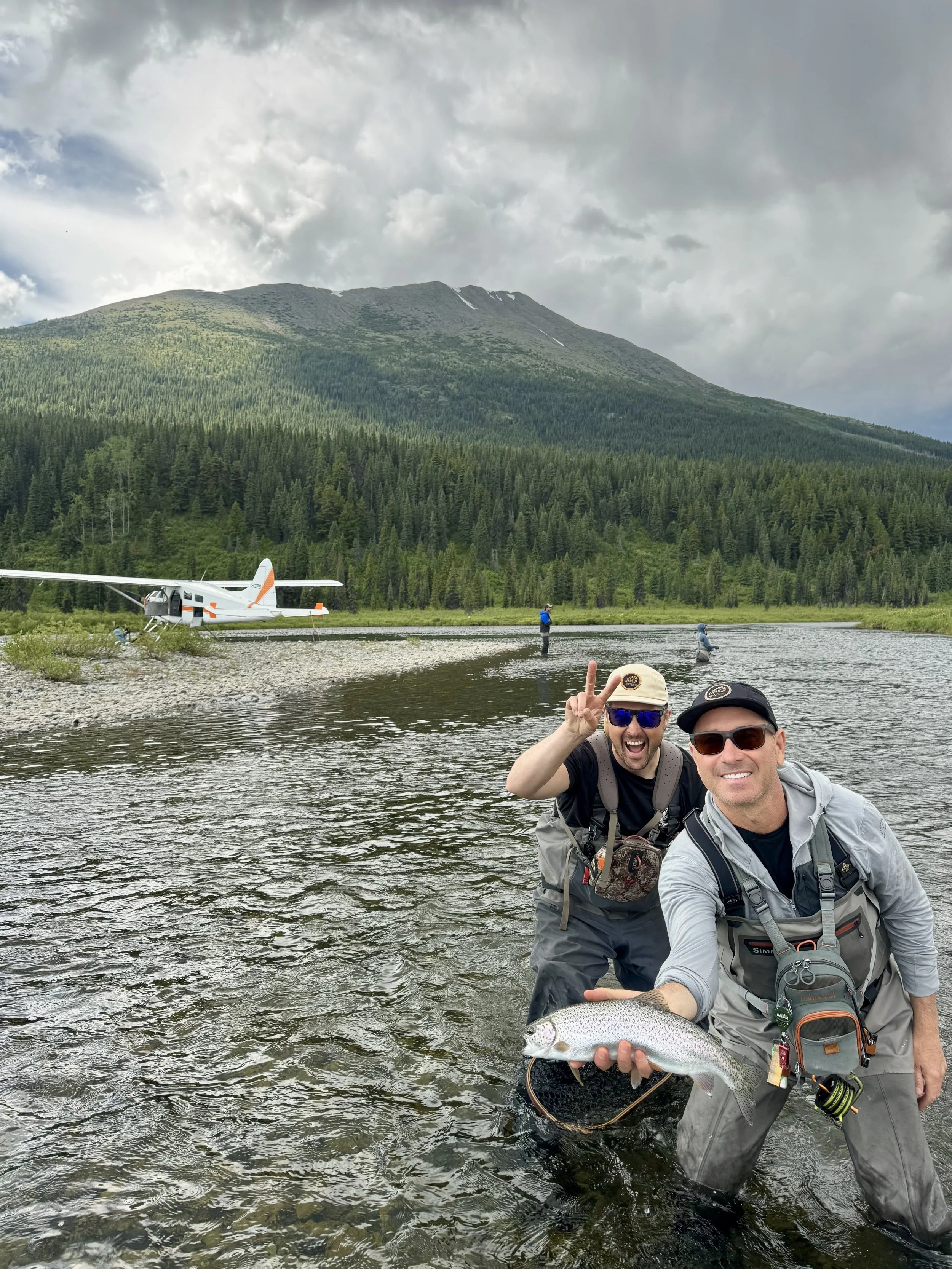 “While I am standing out in the river with T and just taking it all in, here comes our pilot and guide, Tim, wading in the waist deep, cool, clear, water carrying a plate with fork and freshly cooked rainbow.”